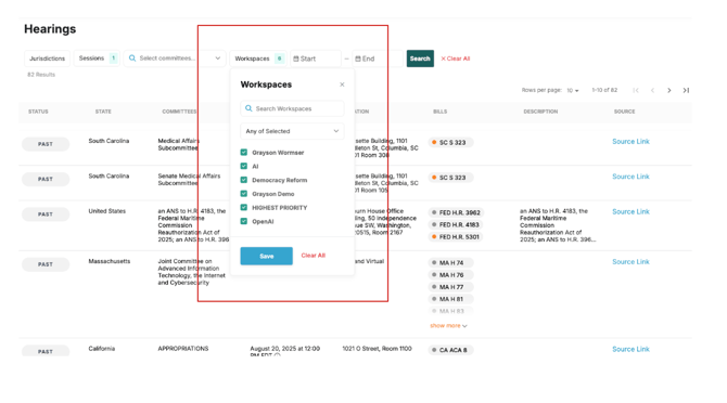 Use the Workspace filter to show only hearings associated with bills tracked in a specific workspace. This is the fastest way to surface: