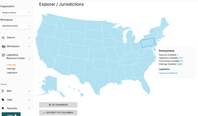 Use the Jurisdiction filter to select one or more states to search across. From there, you can further narrow results by committee within those states or filter hearings to a specific date range.
